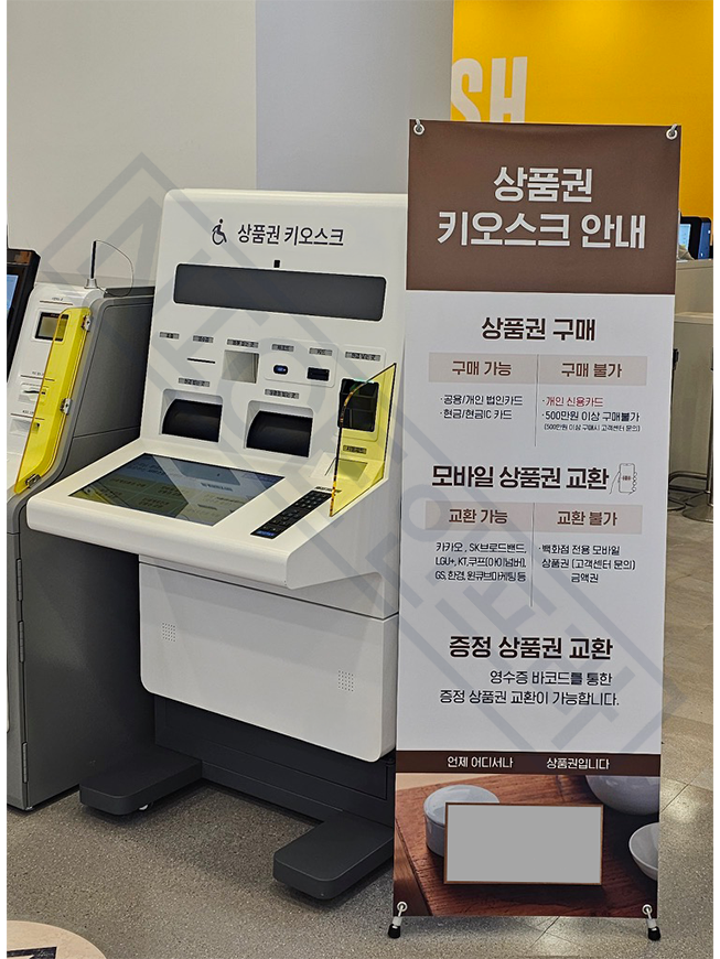 신형 상품권 키오스크는 매장 내 고객센터 앞에 위치하고 있습니다.