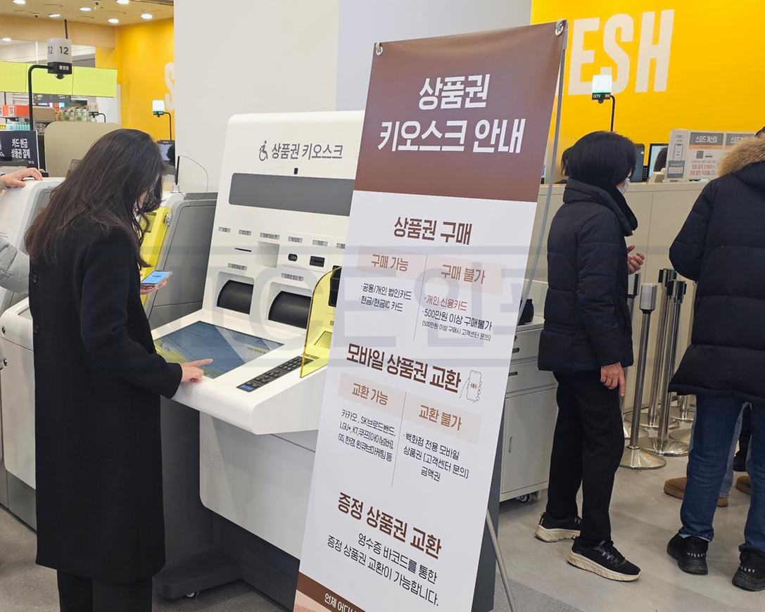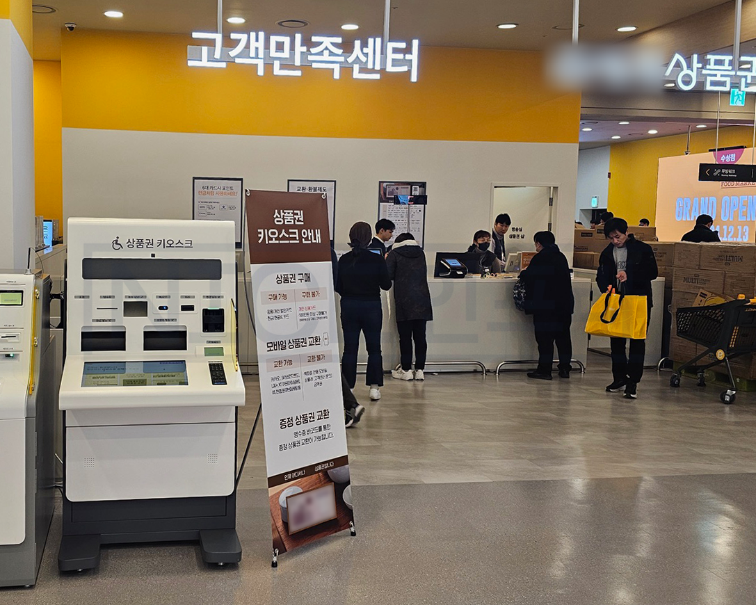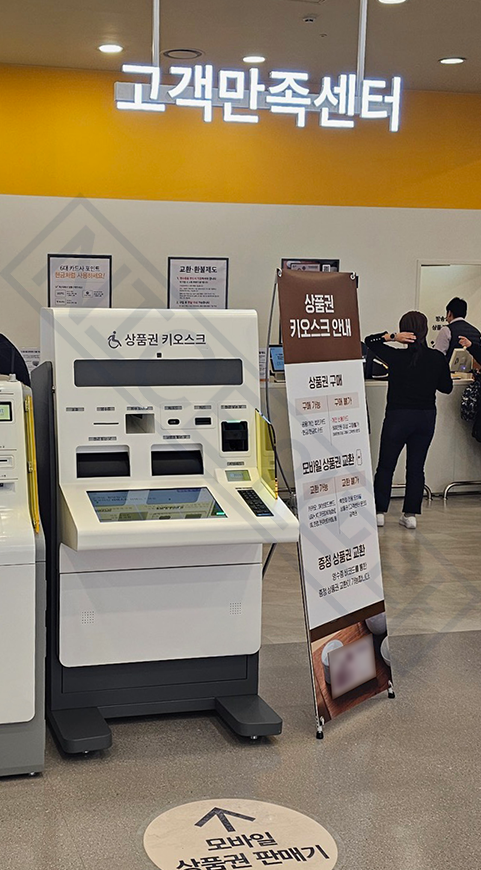 신형 상품권 키오스크는 매장 내 고객센터 앞에 위치하고 있습니다.